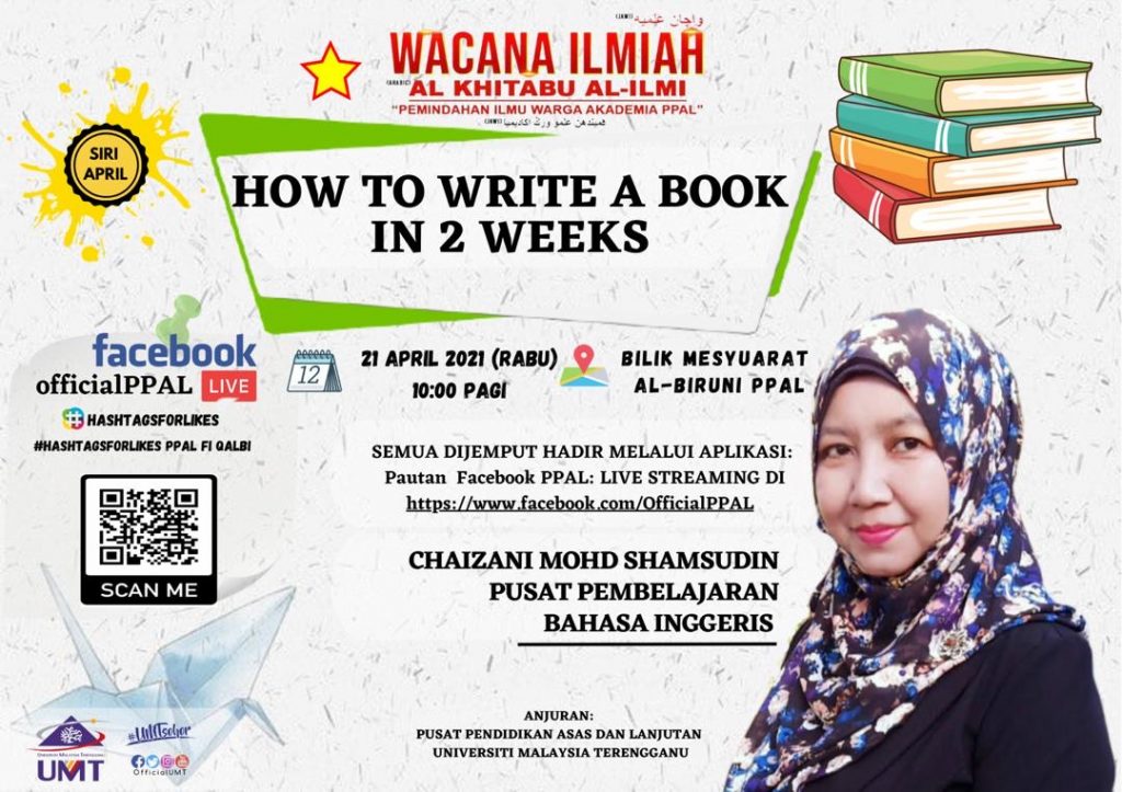 JEMPUTAN WACANA ILMIAH PPAL 2021 SIRI BULANAN KE SESI PEMINDAHAN ILMU WARGA AKADEMIA PPAL BIL. 4/2021 Tarikh : 21 April 2021 (Rabu) Masa : 10.00 pagi Tempat : Aplikasi Webex dan Live FB Pembentang : Pn. Chaizani Mohd Shamsudin (Pusat Pembelajaran Bahasa Inggeris, PPAL) Tajuk : How to write a book in 2 weeks