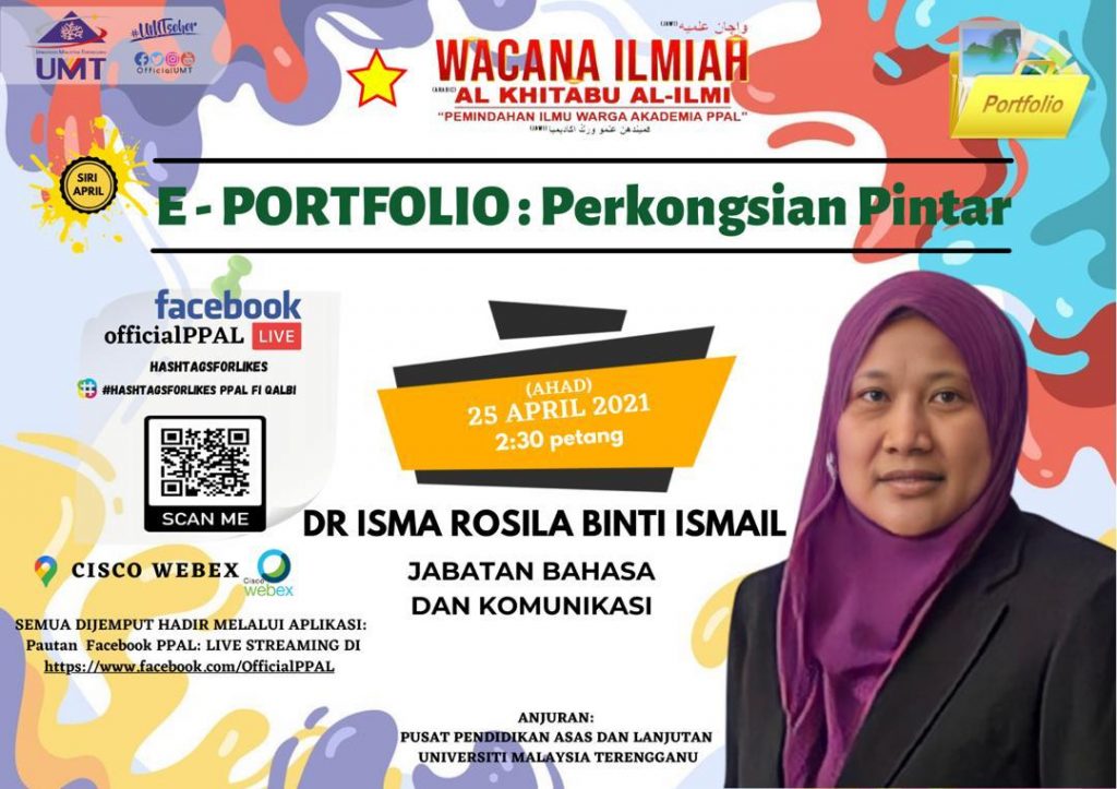 JEMPUTAN WACANA ILMIAH PPAL 2021 SIRI BULANAN KE SESI PEMINDAHAN ILMU WARGA AKADEMIA PPAL BIL. 5/2021 Tarikh : 25 April 2021 (Ahad) Masa : 2.30 petang Tempat : Aplikasi Webex dan Live FB Pembentang 1 : Dr. Isma Rosila binti Ismail (Jabatan Bahasa dan Komunikasi, PPAL) Tajuk : E-Portfolio : Perkongsian Pintar