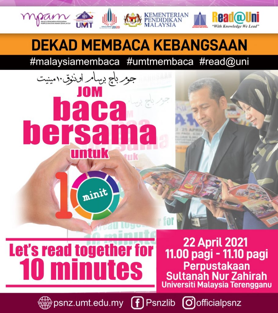 PROGRAM JOM BACA BERSAMA 10 MINIT PUSAT PENDIDIKAN ASAS DAN LANJUTAN (PPAL), UNIVERSITI MALAYSIA TERENGGANU Tarikh : 22 April 2021 Waktu : 11.00 pagi – 11.10 pagi (10 minit) Tempat : PPAL,UMT #malaysiamembaca #umtmembaca #read@uni #Psnzlib