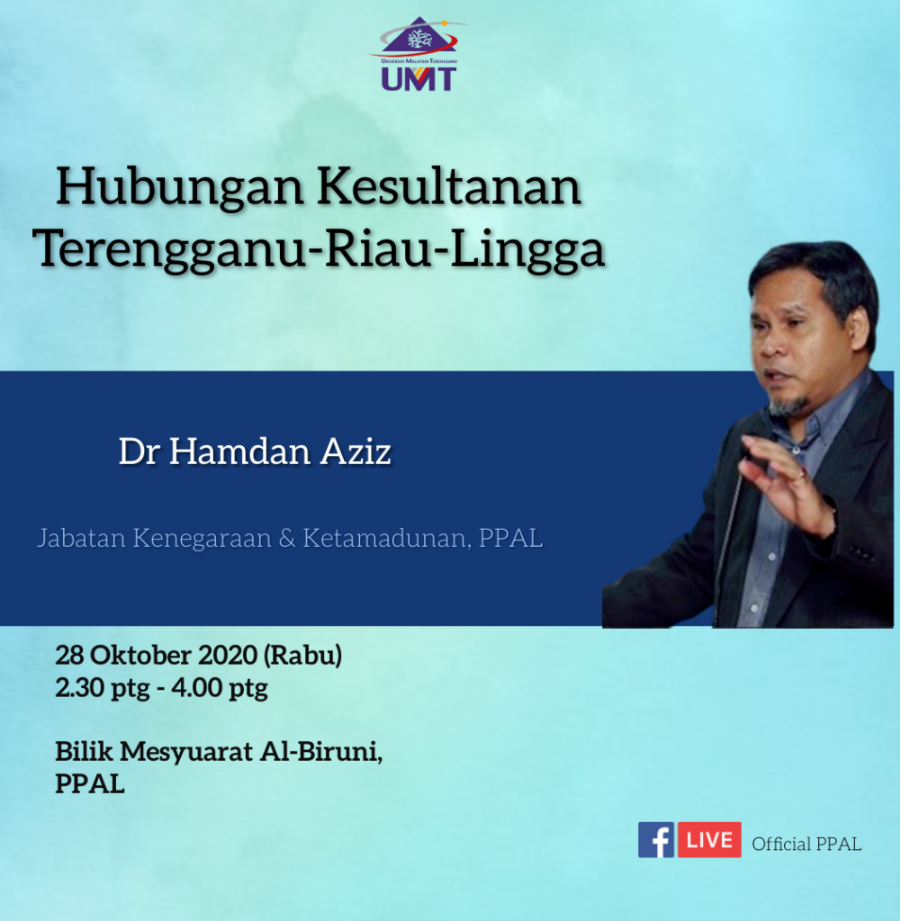 Tarikh : 28 Oktober 2020 (Rabu) Masa : 2.30 petang – 4.00 petang Tempat : Bilik Mesyuarat Al-Biruni, PPAL Pembentang : Dr. Hamdan Aziz (Pensyarah, Jabatan Kenegaraan dan Ketamadunan, PPAL) Tajuk : Hubungan Kesultanan Terengganu-Riau-Lingga