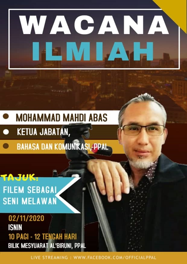 Tarikh : 2 November 2020 (Isnin) Masa : 10.00 pagi – 12.00 tengahari Tempat : Bilik Mesyuarat Al-Biruni, PPAL Pembentang : En. Mohammad Mahdi Abas (Ketua, Jabatan Bahasa dan Komunikasi, PPAL) Tajuk : Filem Sebagai Seni Melawan