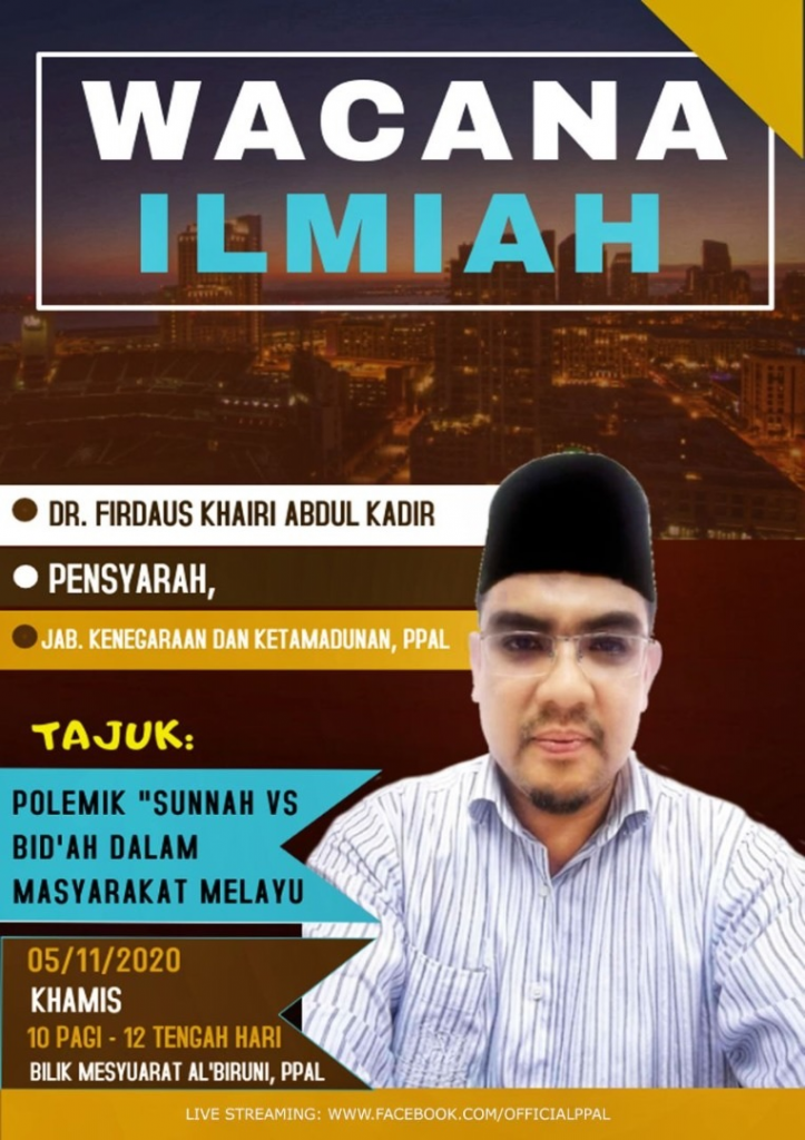 Tarikh : 5 November 2020 (Khamis) Masa : 10.00 pagi – 12.00 tengahari Tempat : Bilik Mesyuarat Al-Biruni, PPAL Pembentang : Dr. Firdaus Khairi Abdul Kadir (Jabatan Kenegaraan dan Ketamadunan, PPAL) Tajuk : Polemik ‘Sunnah vs Bid’ah’ Dalam Masyarakat Melayu
