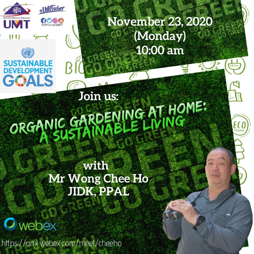 Tarikh : 23 November 2020 (Isnin) Masa : 10.00 pagi – 12.00 tengahari Pembentang : En. Wong Chee Ho (Jabatan Ilmu Dasar dan Keusahawanan, PPAL) Tajuk : Organic Gardening At Home: A Sustainable Living Pautan : https://umt.webex.com/meet/cheeho