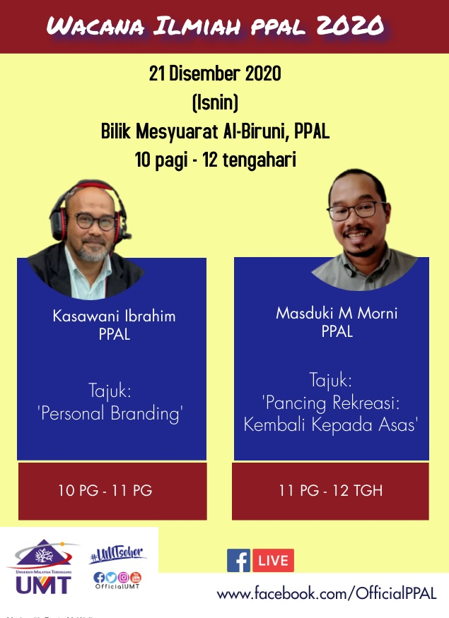 Tarikh : 21 Disember 2020 (Isnin) Masa : 10.00 pagi – 12.00 tengahari Tempat : Bilik Mesyuarat Al-Biruni, PPAL Pembentang 1: En. Kasawani Ibrahim (Jabatan Ko-Kurikulum Berkredit, PPAL) Tajuk : ‘Personal Branding’ Pembentang 2: En. Masduki M Morni (Jabatan Ko-Kurikulum Berkredit, PPAL) Tajuk : ‘Pancing Rekreasi: Kembali Kepada Asas’