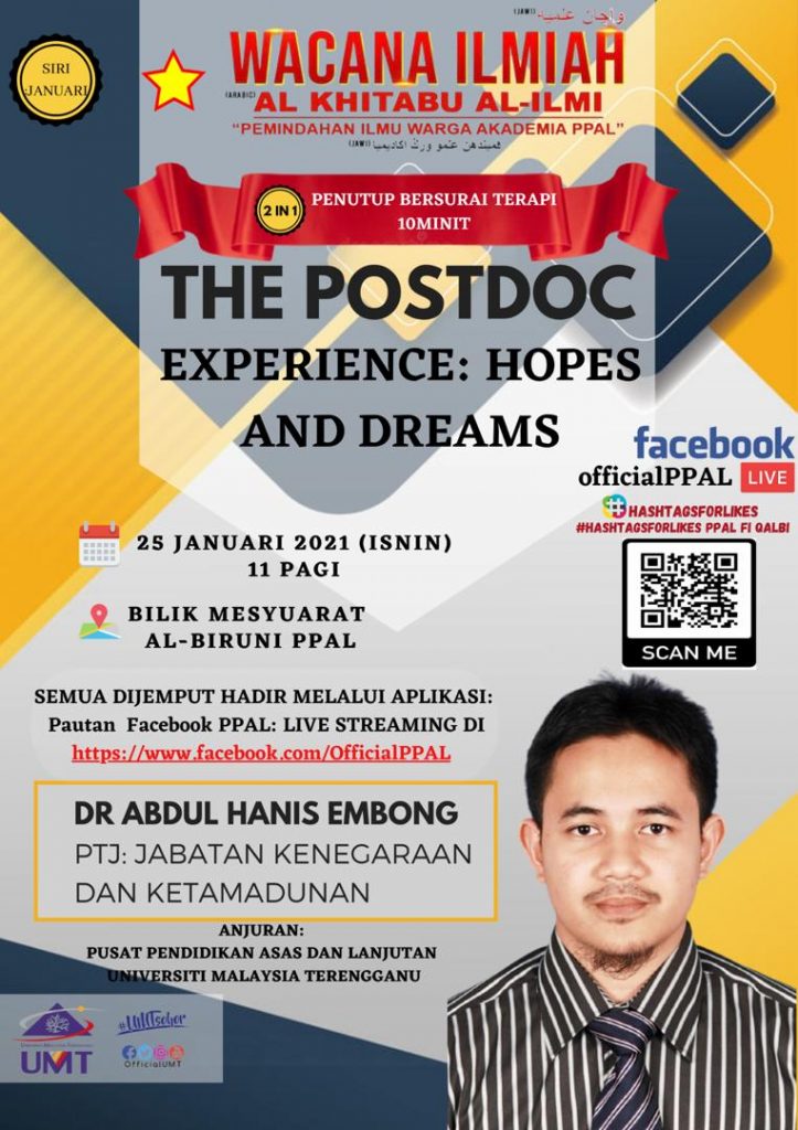 JEMPUTAN WACANA ILMIAH PPAL 2021 SIRI BULANAN KE SESI PEMINDAHAN ILMU WARGA AKADEMIA PPAL BIL.1/2021 Tarikh : 25 Januari 2021 (Isnin) Masa : 10.00 pagi – 12.00 tengahari Tempat : Bilik Mesyuarat Al-Biruni, PPAL Pembentang : Dr. Abdul Hanis bin Embong (Jabatan Kenegaraan dan Ketamadunan, PPAL) Tajuk : THE POSTDOC EXPERIENCE: HOPES AND DREAMS